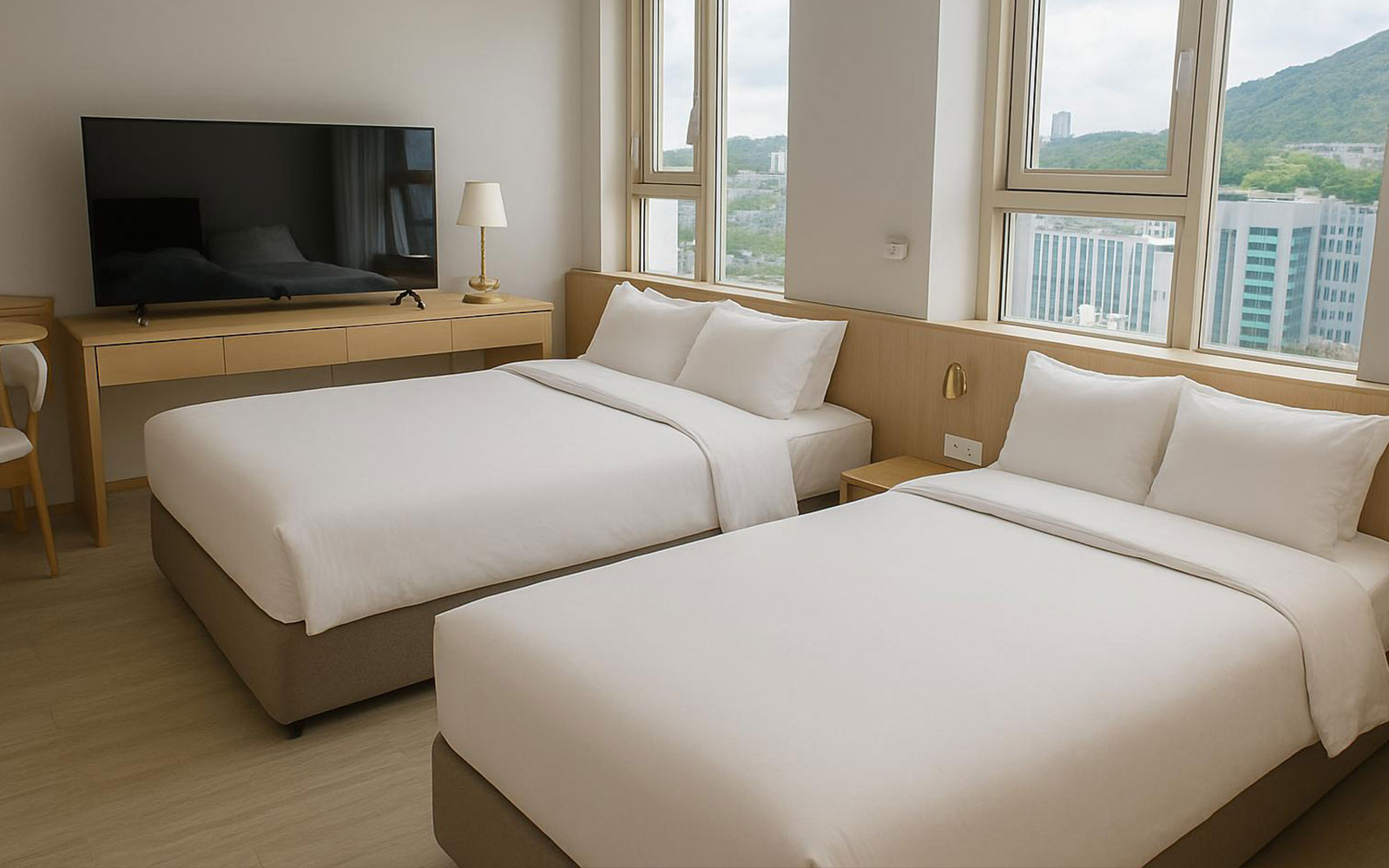 함께여도 개별 침대를 선호하는 투숙객을 위한 표준 트윈 타입. 폭 1,100mm 싱글베드 2개를 갖춰 쾌적한 수면 공간을 제공합니다. 유아 1명 동반 가능으로 가족 초행에도 부담이 적습니다.
